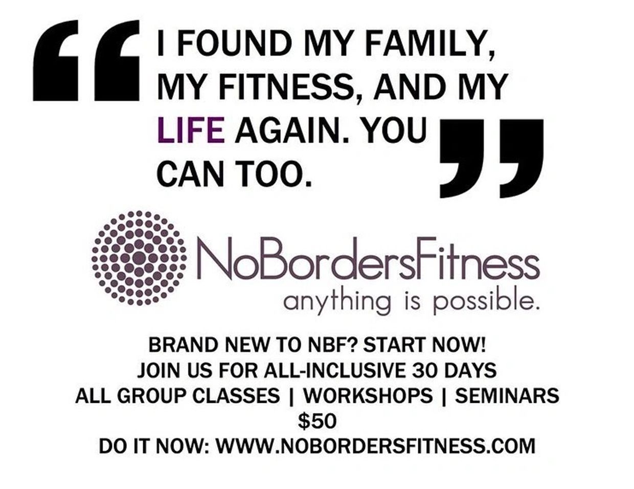 You have arrived! Welcome to No Borders Fitness. We have so many ways you can join our fitness community. Click here to begin the journey now!